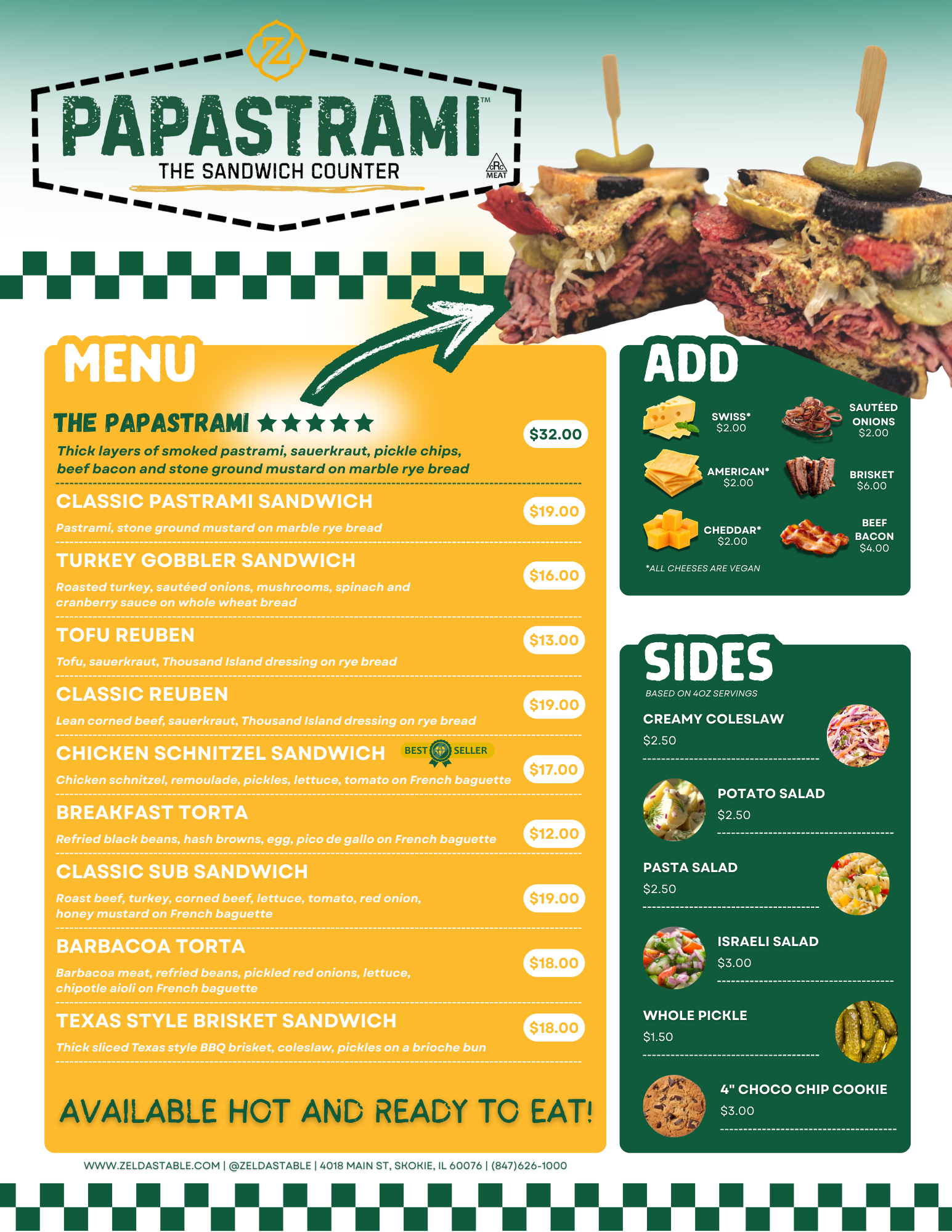 Welcome to Papastrami, the sandwich counter at Zelda’s Table - your destination for hot, fresh, made-to-order gourmet sandwiches, stacked high and bursting with flavor. ORDER HERE!